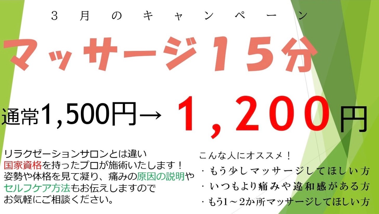 今月のキャンペーンは15分マッサージです!